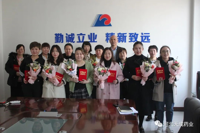 3月8日上午,河北天成藥業開展“風華時代女性,共建美麗天成“三●八"紅旗手頒獎活動。公司黨總.支副書記、工會主席王頤為接受表彰的17位先進個人頒發“三●八"紅旗手證書、鮮花和獎品。